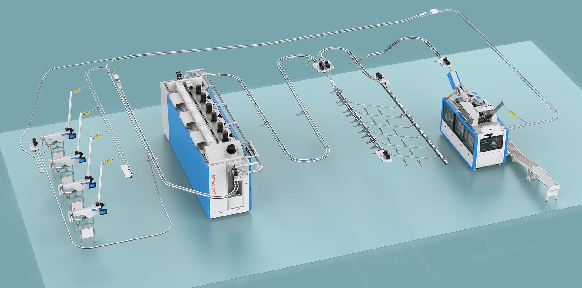 工服上料機(jī)、隧道式自動(dòng)化整燙機(jī)、工服折疊機(jī)組成